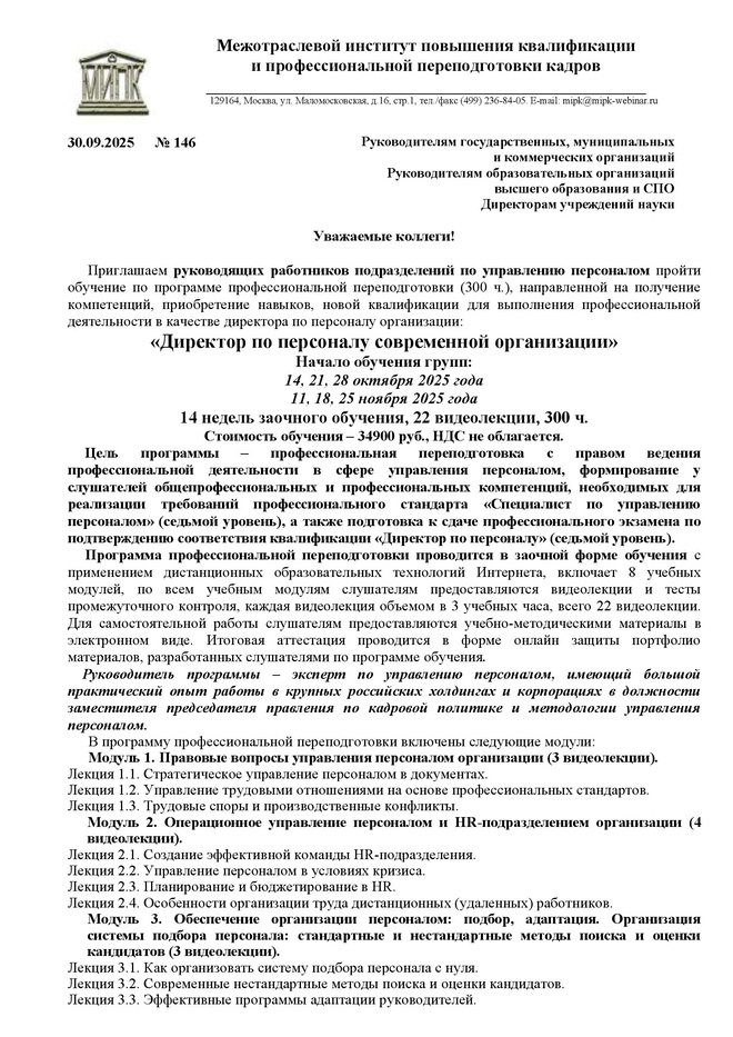 Директор по персоналу современной организации / профессиональная переподготовка 300 ч., онлайн, начало обучения: 14, 21, 28 октября, 11, 18, 25 ноября 2025 г.