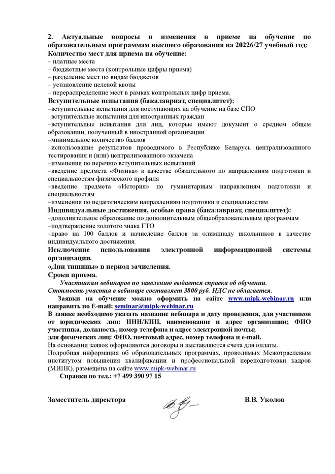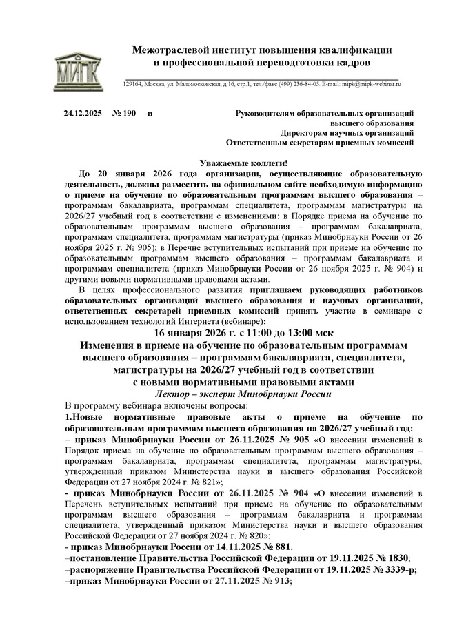 Главная > Вебинары > Изменения в приеме на обучение по образовательным программам высшего образования – программам бакалавриата, специалитета, магистратуры на 2026/27 учебный год в соответствии с новыми нормативными правовыми актами / вебинар 16 января 2026 г.