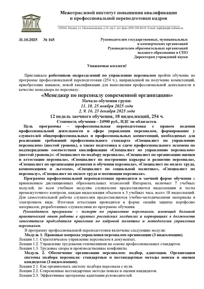 Главная > Программы профессиональной переподготовки > Менеджер по персоналу современной организации / профессиональная переподготовка 254 ч., онлайн, начало обучения: 11, 18, 25 ноября, 2, 9, 16, 23 декабря 2025 г.