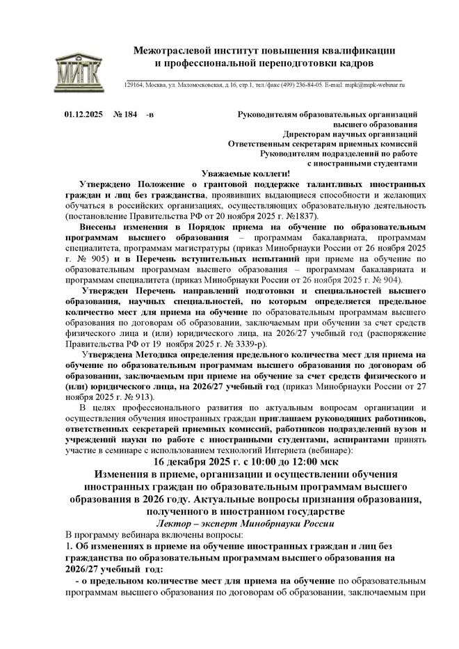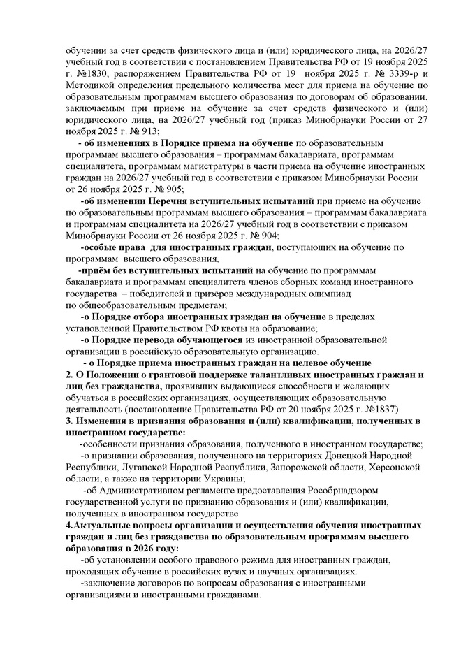 Главная > Вебинары > Изменения в приеме, организации и осуществлении обучения иностранных граждан по образовательным программам высшего образования в 2026 году. Актуальные вопросы признания образования, полученного в иностранном государстве / вебинар 16 декабря 2025 г.