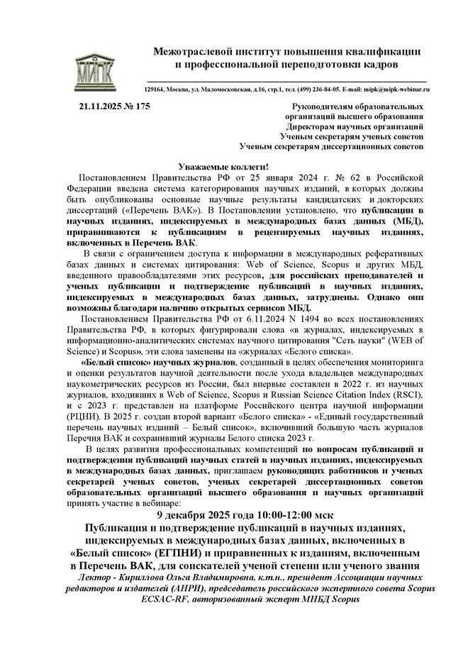 Главная > Вебинары > Подготовка и подтверждение публикаций в научных изданиях из международных баз данных для соискателей ученых степеней и ученых званий / вебинар 9 декабря 2025 г.
