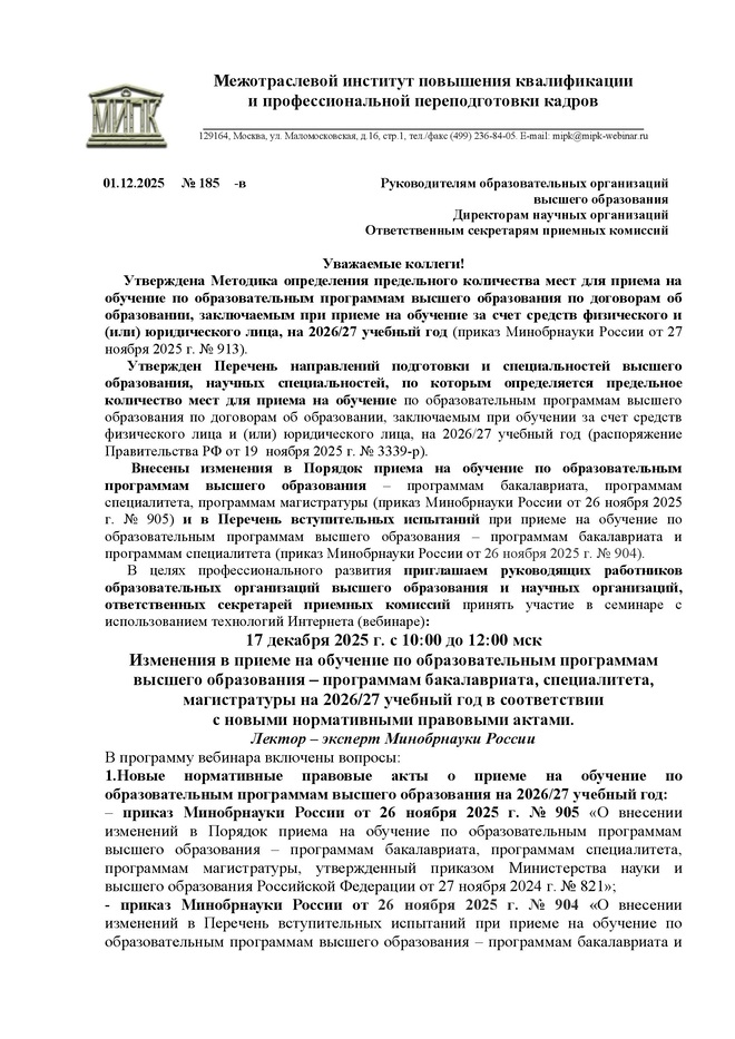 Главная > Вебинары > Изменения в приеме на обучение по образовательным программам высшего образования – программам бакалавриата, специалитета, магистратуры на 2026/27 учебный год в соответствии с новыми нормативными правовыми актами / вебинар 17 декабря 2025 г.