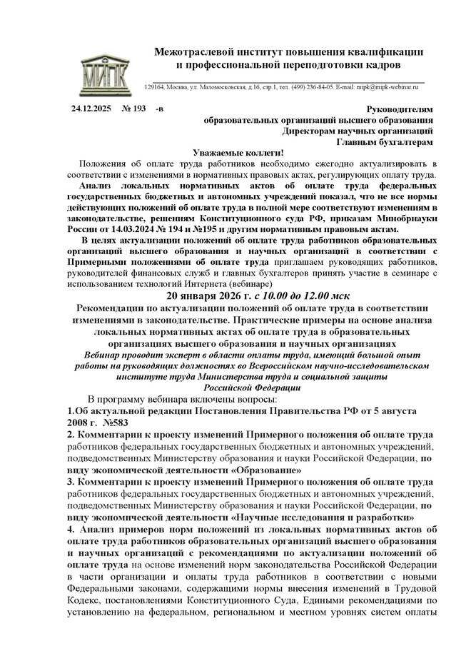 Главная > Вебинары > Рекомендации по актуализации положений об оплате труда в соответствии изменениями в законодательстве. Практические примеры на основе анализа локальных нормативных актах об оплате труда в образовательных организациях высшего образования и научных организациях / вебинар 20 января 2026 г.