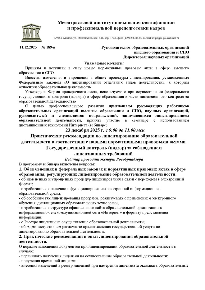 Практические рекомендации по лицензированию образовательной деятельности в соответствии с новыми нормативными правовыми актами. Государственный контроль (надзор) за соблюдением лицензионных требований / вебинар 23 декабря 2025 г.
