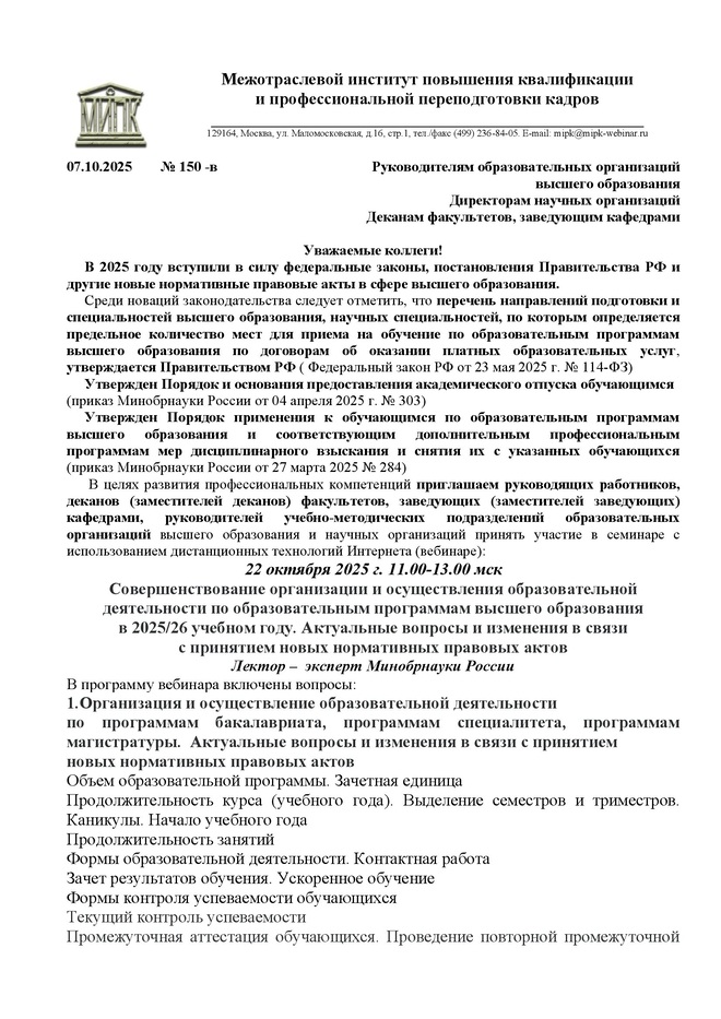 Главная > Вебинары > Совершенствование организации и осуществления образовательной деятельности по образовательным программам высшего образования в 2025/26 учебном году. Актуальные вопросы и изменения в связи с принятием новых нормативных правовых актов / вебинар 22 октября 2025 г.